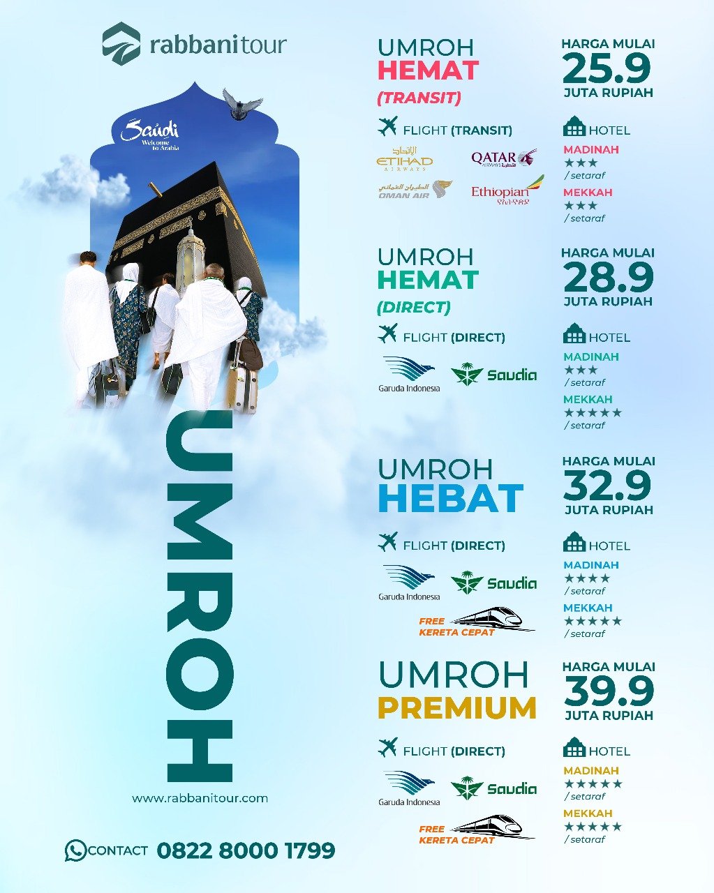 Rabbanitour menyediakan banyak pilihan tanggal keberangkatan dengan pilihan paket dan maskapai penerbangan untuk menjamin kenyamanan perjalanan umroh Anda dan keluarga.
